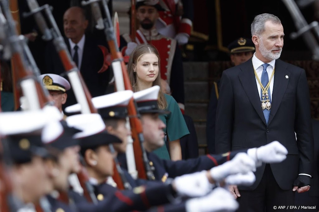 Op beelden van afgelopen vrijdag, die het Spaanse hof maandag heeft verspreid, is te zien dat de koning zich in militair outfit tussen de cadetten mengde. Hij keek toe bij een oefening en lunchte mee met zijn dochter en haar metgezellen. Op een van de foto’s geeft Felipe zijn dochter een schouderklop.