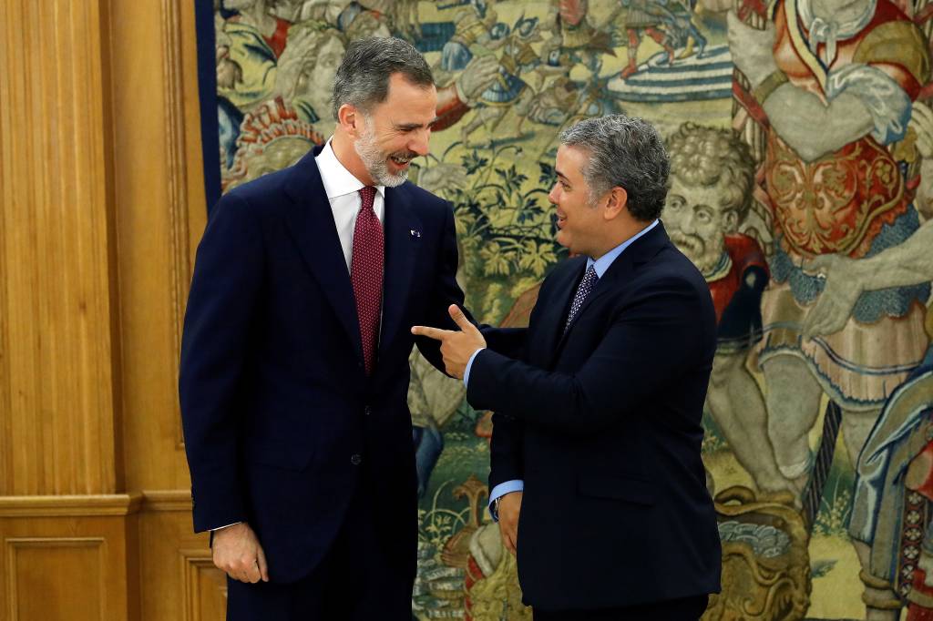 Koning Felipe van Spanje heeft vrijdag de nieuwe president van Colombia Iván Duque ontvangen in het Zarzuela Paleis in Madrid. Bij de audiëntie was ook de Spaanse minister van Buitenlandse Zaken Josep Borrell aanwezig.