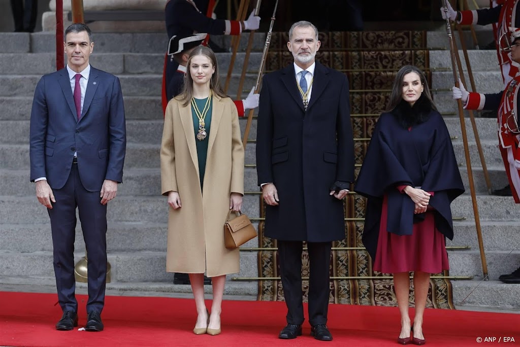 Felipe, Letizia en Leonor kwamen woensdag gezamenlijk aan bij het gebouw van de zogeheten Cortes Generales: het Huis van Afgevaardigden en de Senaat. Ook Sánchez was bij dat moment aanwezig. Het gezelschap ging vervolgens door de alleen bij dit soort officiële gelegenheden geopende Leeuwendeur – Puerta de los Leones – naar binnen.