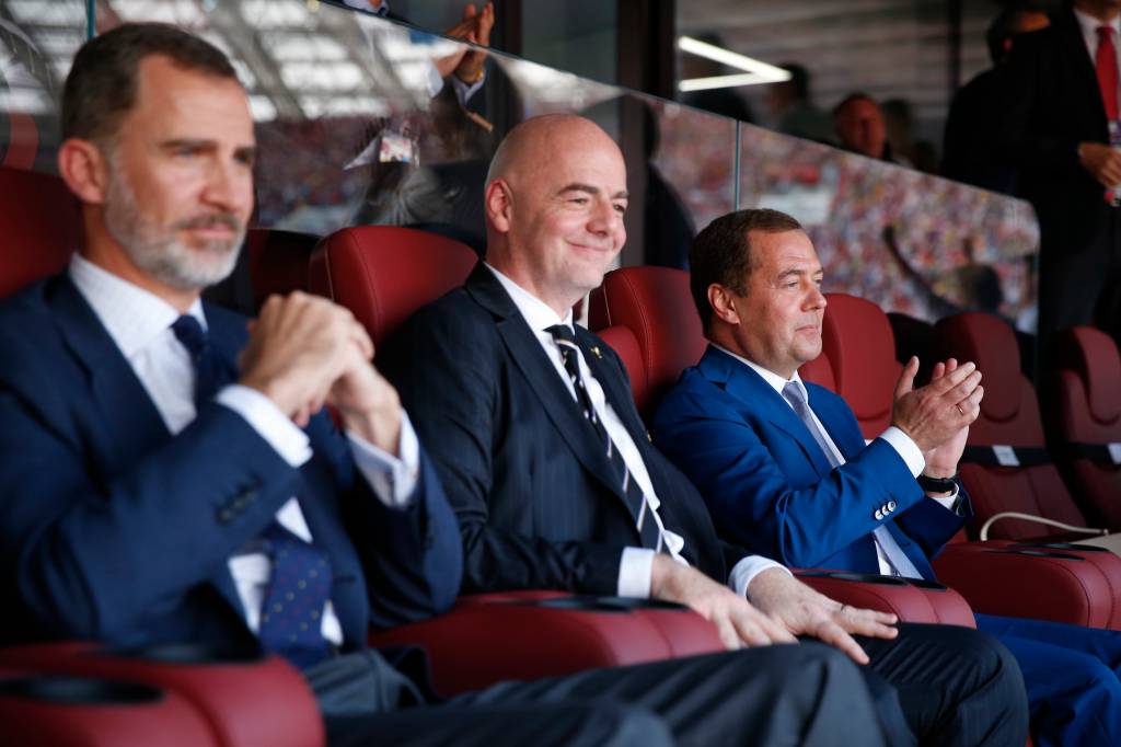 Felipe had in het stadion in Moskou gezelschap van FIFA-baas Gianni Infantino, die vorige week ook al met de Belgische koning Filip op de tribune zat. Ook de Russische premier Dmitri Medvedev zat naast Felipe. De Spaanse vorst trok zich tijdens de wedstrijd ook even terug voor een kort onderonsje met Medvedev. Wat er is besproken, is niet bekendgemaakt.