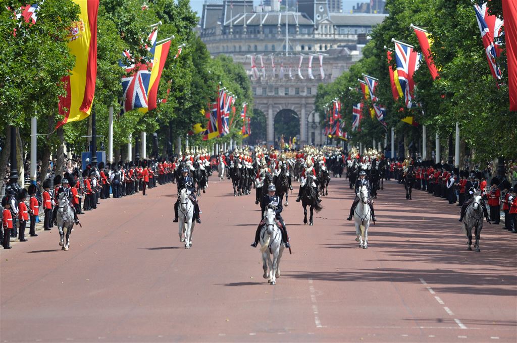 Op de paradegrond waar jaarlijks ook Trooping the Colour wordt gehouden en in 2012 bij de Olympische Spelen het beachvolleybaltoernooi werd afgewerkt, wachtte de koningin haar Spaanse bezoekers op. Na het spelen van de volksliederen en het inspecteren van de erewacht, stapte het gezelschap in de wachtende open rijtuigen voor de korte rit over de Mall naar Buckingham Palace.