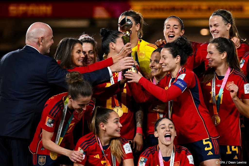 Koningin Letizia heeft zondagmiddag de Spaanse voetbalsters de WK-beker overhandigd. Het team won in Sydney de finale tegen Engeland. Letizia poseerde na de winst met het team voor een foto en hield trots de trofee in de lucht.
