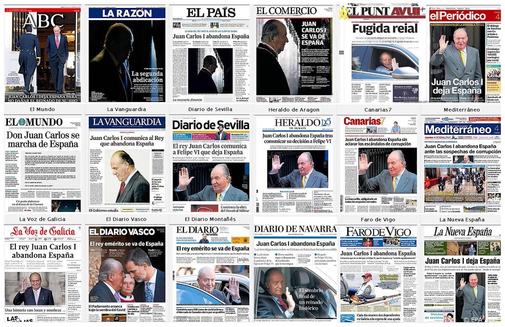 Het vertrek van koning Juan Carlos naar het buitenland beheerst dinsdag alle Spaanse kranten. Bijna alle voorpagina’s zijn geheel gevuld met het vertrek, al dan niet met grote koppen en foto’s.