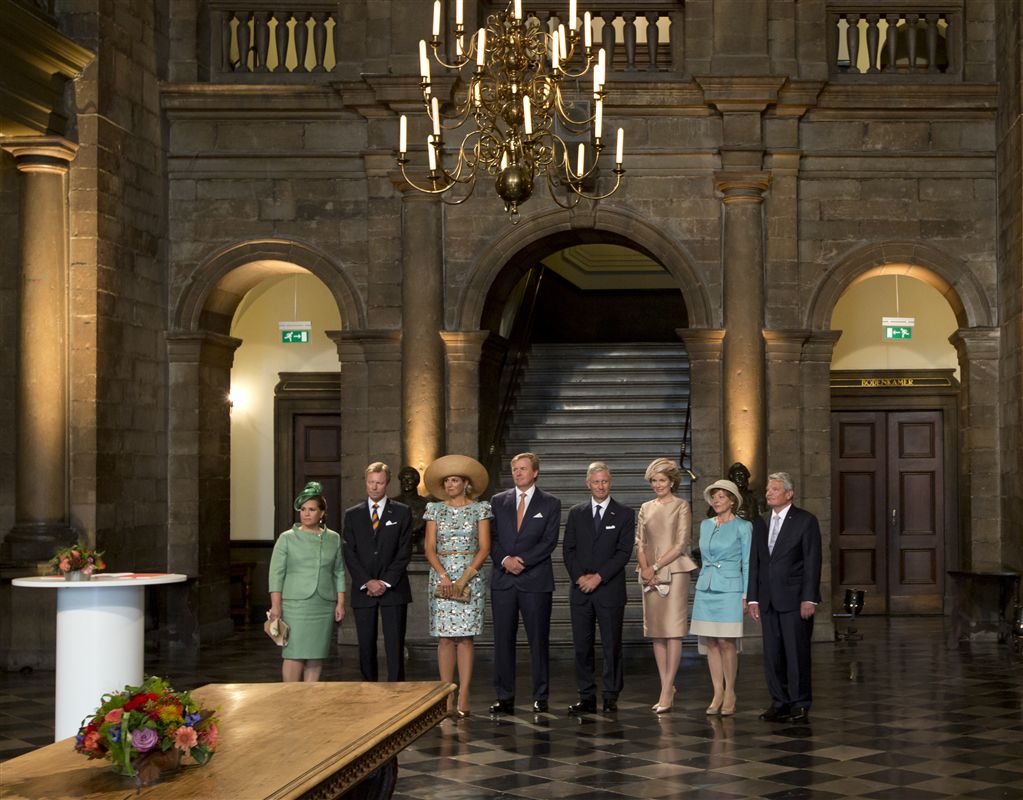 Koning Willem-Alexander, de Belgische koning Filip, groothertog Henri van Luxemburg en de Duitse bondspresident Joachim Gauck werden in het stadhuis ontvangen kort na hun aankomst op de Markt. Daarna genoten ze vanaf een tribune van het grenzeloze muziek- en kunstmodespektakel Hello World!