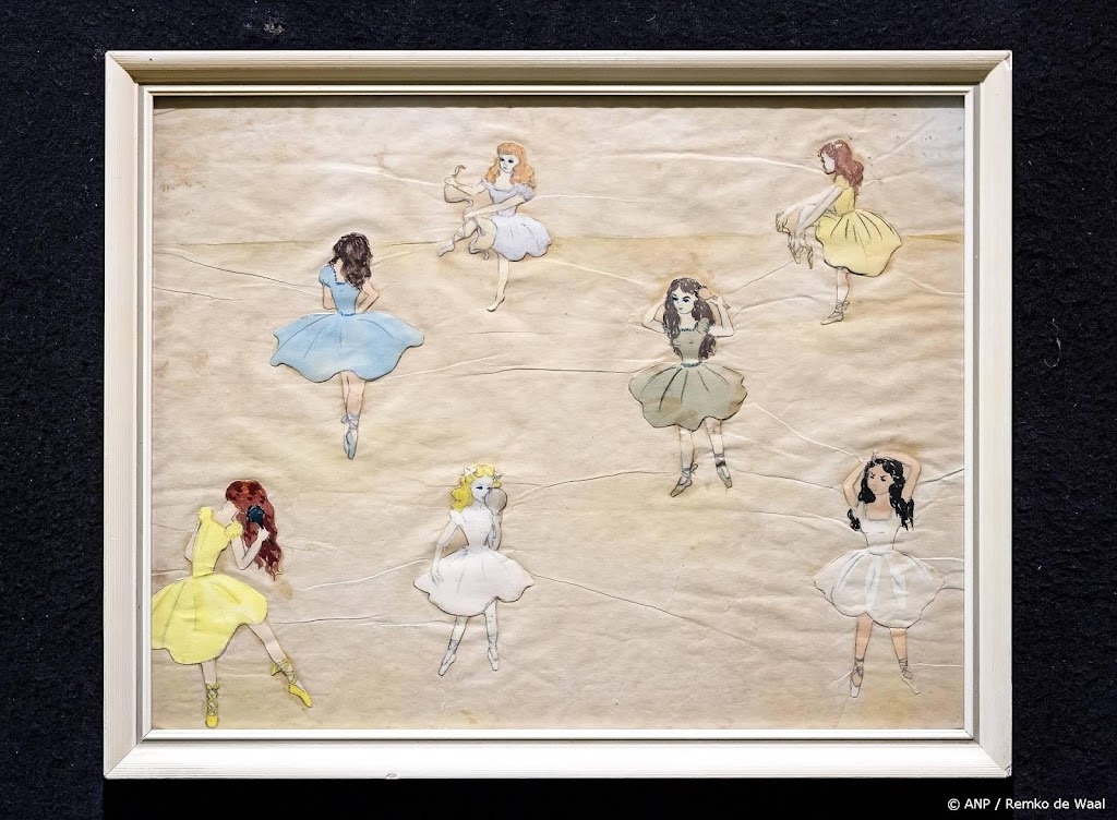 Een van de werken heet ‘Veld met hondjes’, gemaakt door ‘TVO’, zo is onderaan te lezen. Deze afkorting staat voor Trix van Oranje. Het andere kunstwerkje is er een van ballerina’s, gemaakt met potlood, aquarel en collage.