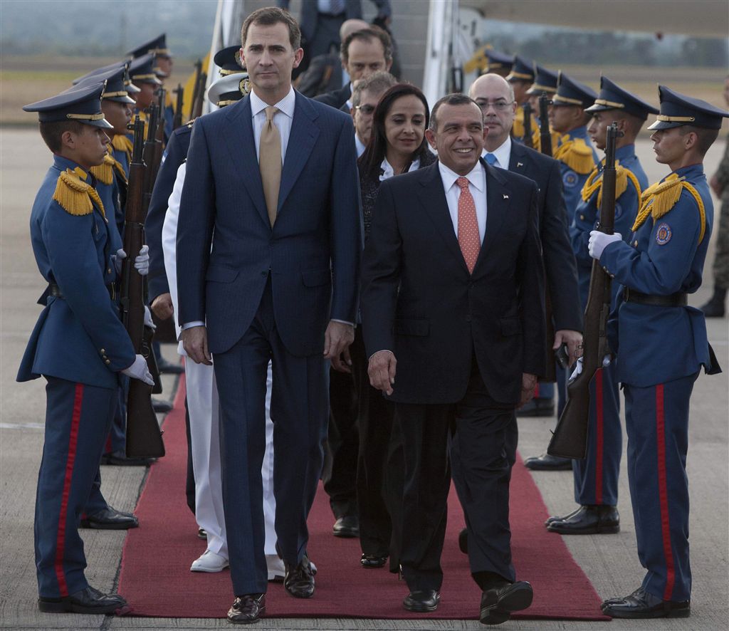 Felipe werd op het militaire vliegveld Soto Cano Air Base welkom geheten door de aftredende president Porfirio Lobo Sosa. Felipe moet zijn programma in Honduras enigszins aanpassen door zijn late aankomst, zo meldt de website Publico op basis van mededelingen van het hof.
