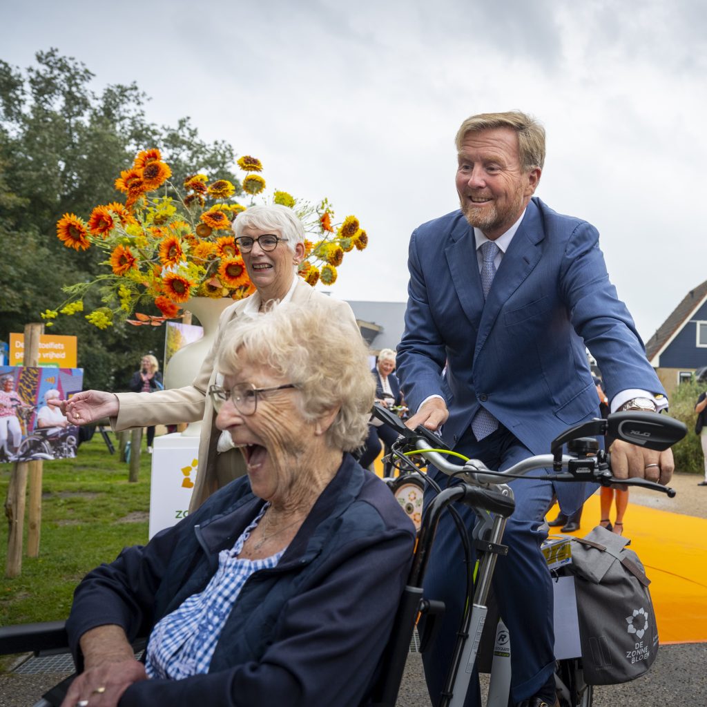Koning Willem-Alexander heeft woensdag een stukje gereden op een zogeheten rolstoelfiets. Dat deed hij bij de viering van het 75-jarige bestaan van Nationale Vereniging de Zonnebloem in het Friese Mirns. Op de speciale driewielerfiets kan een rolstoel voorop zodat mensen met een lichamelijke beperking er toch op uit kunnen. De koning en zijn vrouwelijke passagier hadden er zichtbaar lol in toen Willem-Alexander een paar rondjes over het terrein trapte.