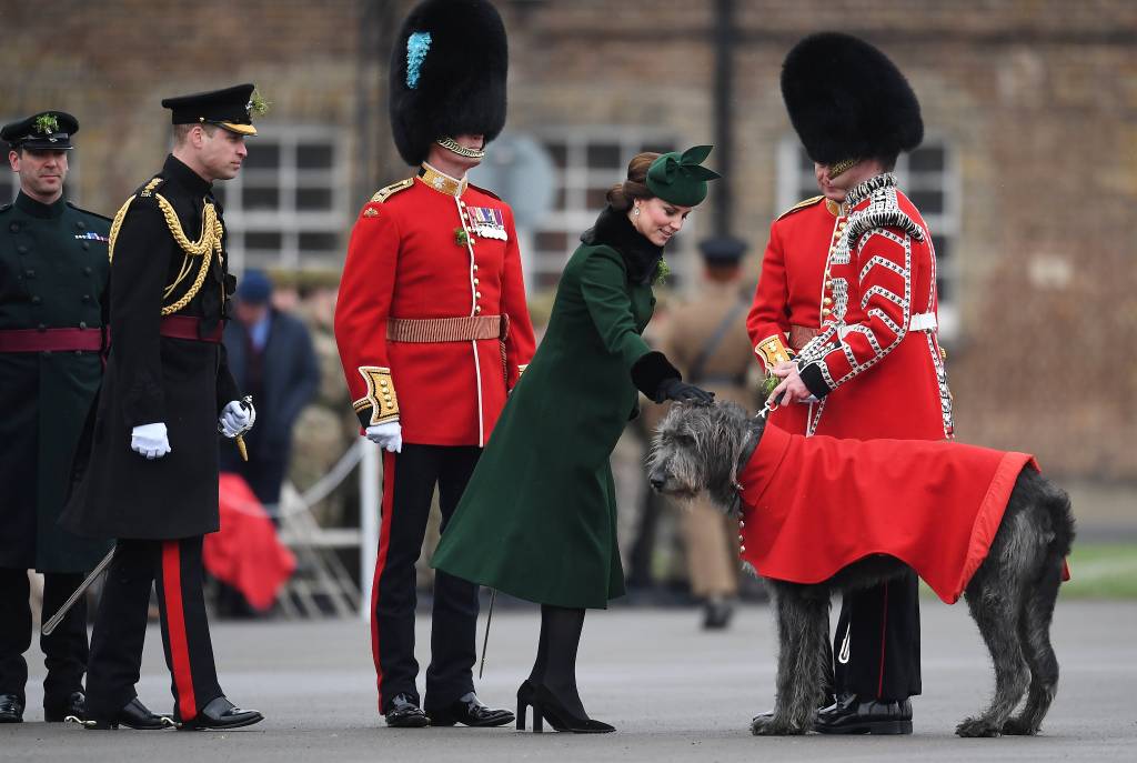 Er werden traditiegetrouw klavertjes uitgedeeld, waarbij Catherine een klavertje gaf aan de Ierse wolfshond Dornhnall, de mascotte van het regiment. Prins William is kolonel van de Irish Guards.