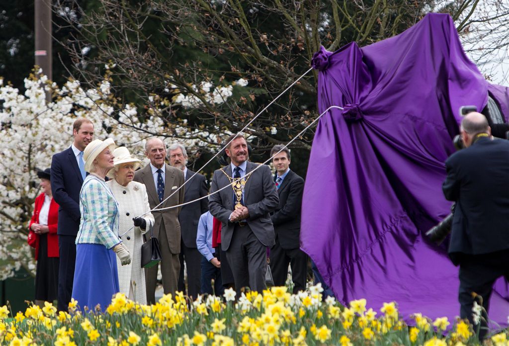 Het beeld is gemaakt ter ere van het 60-jarig jubileum van de koningin. Het zijn twee Windsor Grey-paarden, het ras paarden dat wordt gebruikt voor onder meer het trekken van de koetsen van het Koninklijk Huis. Bij de onthulling waren zo’n 400 mensen aanwezig.