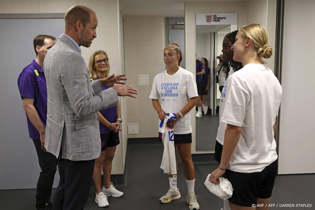 Met een aantal selectiespeelsters ging William op de foto voor de shirtpresentaties. Ook sprak hij met bondscoach Sarina Wiegman en functionarissen van de voetbalbond over hoe het team zich voorbereidt op het eindtoernooi, waar het aankomende zaterdag als titelverdediger het opneemt tegen Frankrijk.