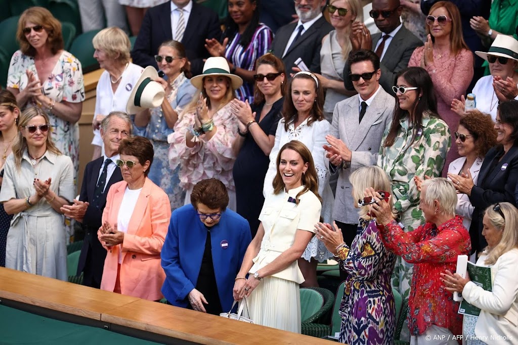 Het is de eerste keer dat de prinses bij de vrouwenfinale op het tennistoernooi is, sinds haar kankerdiagnose vorig jaar. Ze was wel bij de laatste mannenfinale, toen samen met haar dochter prinses Charlotte en haar jongere zus Pippa Matthews. Ook toen werd de prinses al met veel enthousiasme door het publiek ontvangen, vooral omdat het pas haar tweede publieke verschijning was sinds ze haar diagnose bekendmaakte.