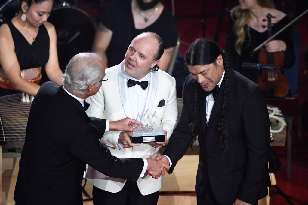 Metallica was niet compleet bij de prijsuitreiking in het Grand Hôtel in Stockholm. Alleen drummer Lars Ulrich en basgitarist Robert Trujillo waren van de partij.