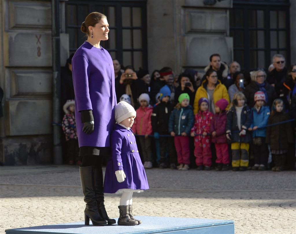 Bij de plechtigheid waarbij militairen namens de Lijfgarde onder meer bloemen aanbieden aan de kroonprinses, was ook Victoria’s jonge dochtertje Estelle aanwezig. Die nam het huldeblijk met haar moeder in ontvangst en klapte enthousiast na het driewerf hoera van de op het plein aangetreden manschappen.
