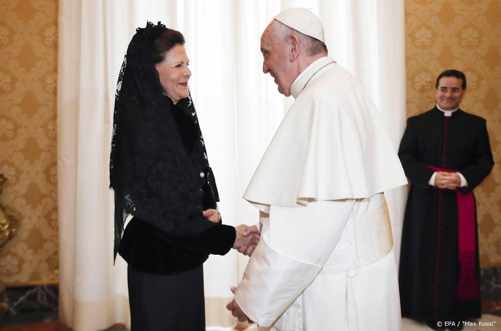 Voorafgaand aan het congres had Silvia een ontmoeting met paus Franciscus, zo is te zien op foto’s van het Zweedse koninklijk huis. De paus, geheel in het wit, schudt handen met de geheel in het zwart geklede Silvia.