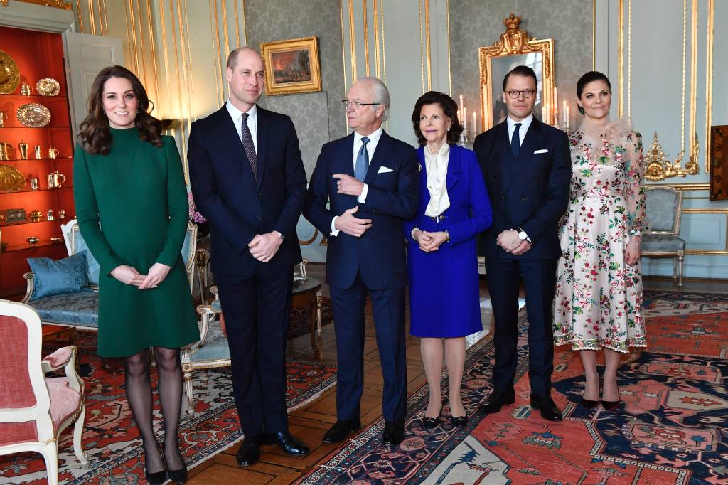 Koning Carl Gustaf en koningin Silvia van Zweden hebben dinsdag de Britse prins William en zijn vrouw Kate ontvangen voor een lunch op het Koninklijk Paleis in Stockholm. Ook kroonprinses Victoria en haar man prins Daniel prikten een vorkje mee.