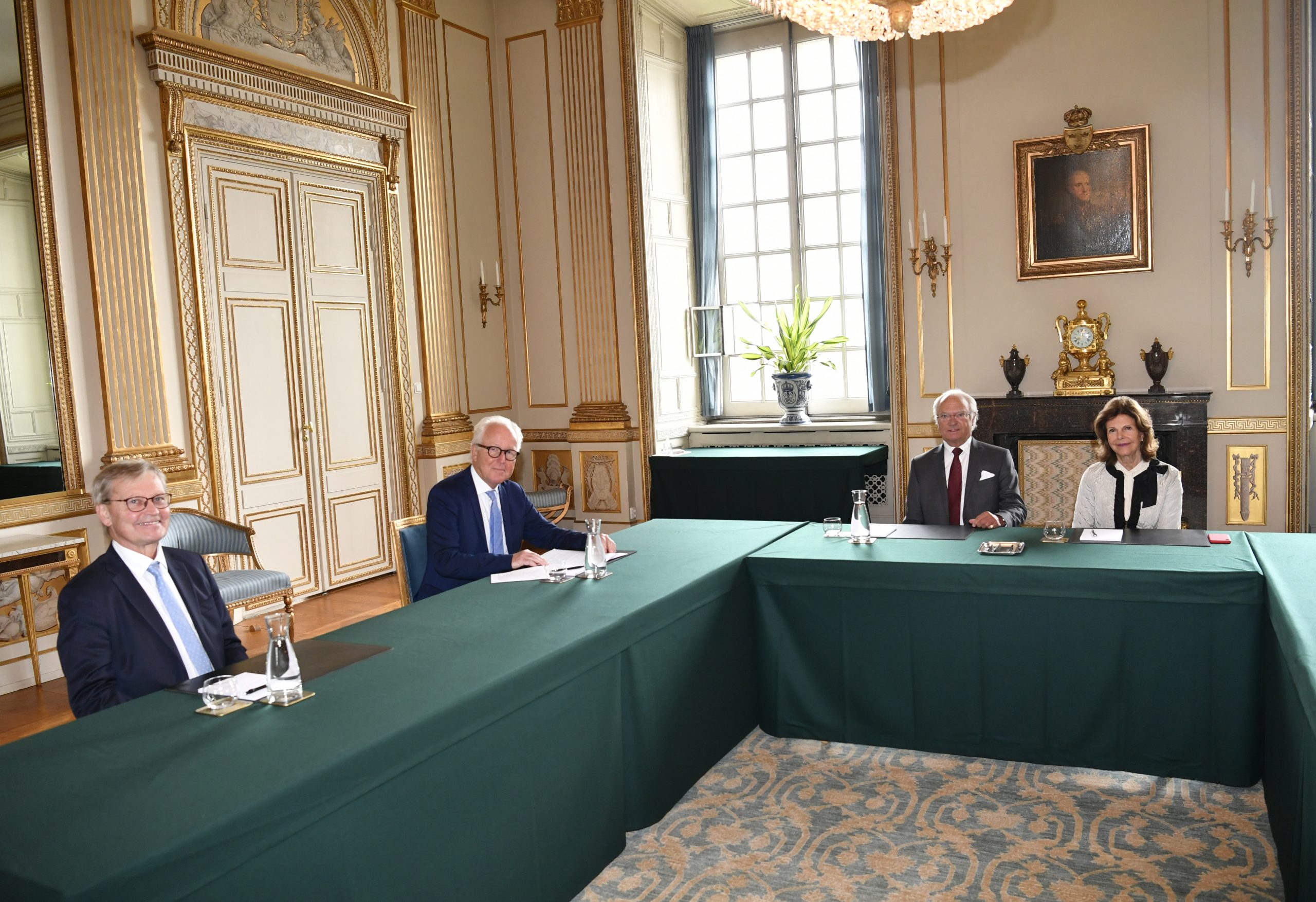 Koning Carl Gustaf en koningin Silvia hebben op hun eerste werkdag in het Koninklijk Paleis de voorzitter en de directeur van de Nobel-stichting ontvangen. Met Carl-Hendrik Heldin en Lars Heikensten bespraken ze de situatie die is ontstaan door de afgelasting van de gebruikelijke activiteiten rond de jaarlijkse uitreiking van de Nobelprijzen.
